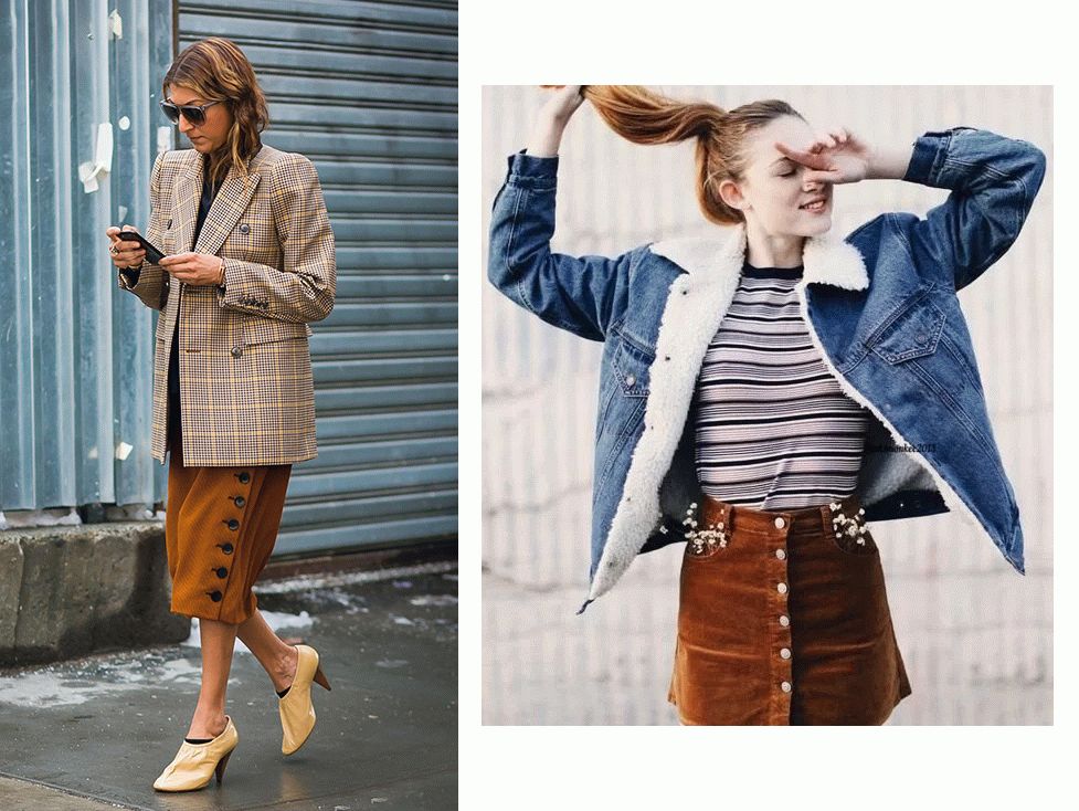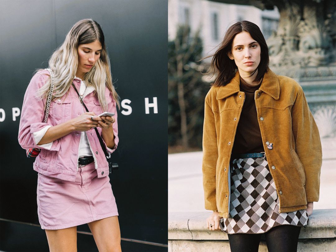 当然,也不是所有妹子都在追求帅气感的,时装精们也一样。碰上想要体现女人味的时候,她们也会用灯芯绒西装搭配裙子。