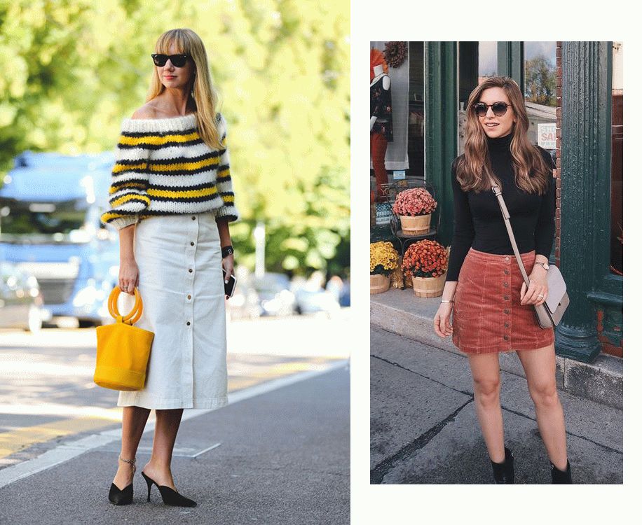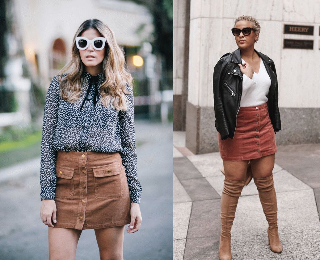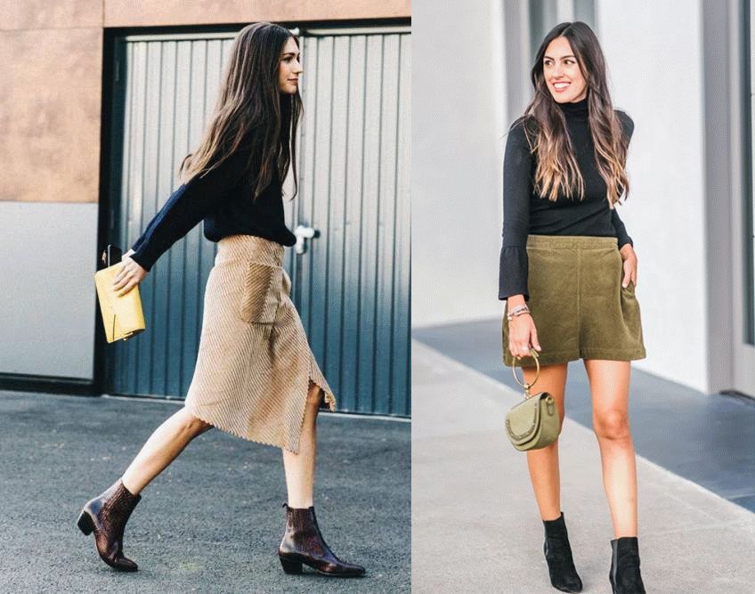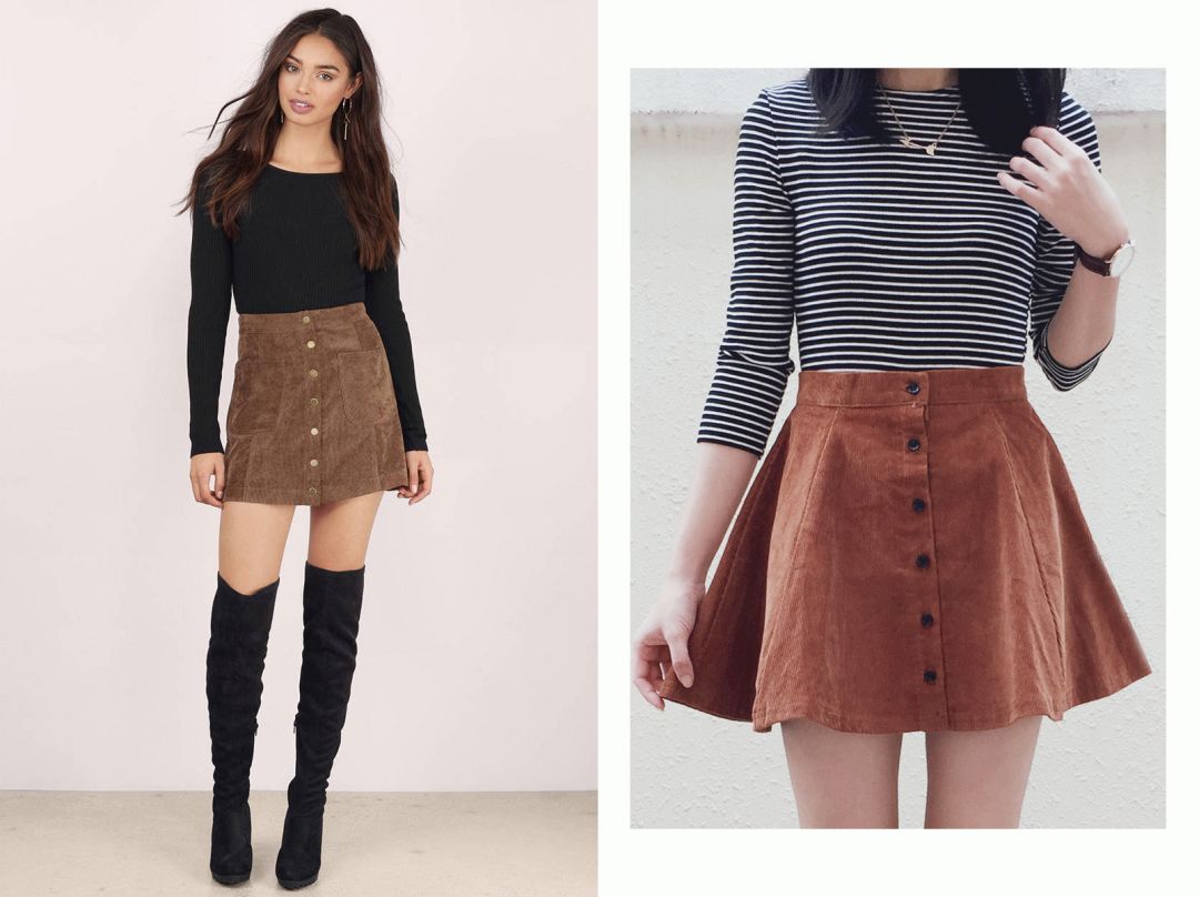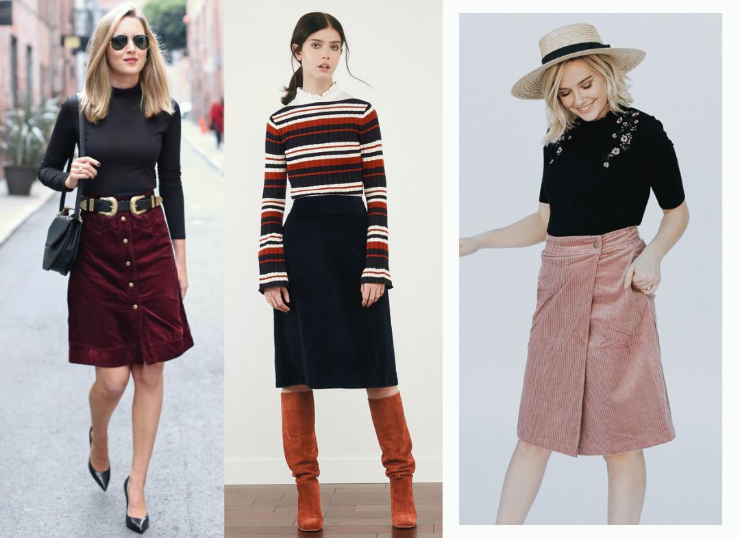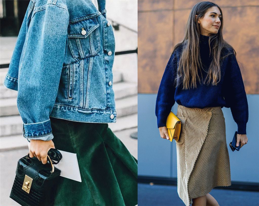 灯芯绒半裙中也有中长款的,这种长度就比较适合大腿粗的女生。但是选品的时候要注意,右图那种粗条的半裙显瘦效果就不如另两张细条的。宽坑条做成裙子,只推荐给下身瘦的女生尝试。