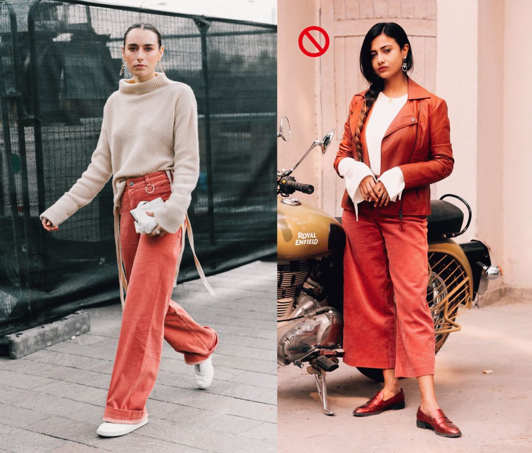 另外,针对于这种不够垂的面料,既然不能通过材质来纵向延伸了,那就必须通过裤长来延伸。所以,如果你觉得自己腿粗,要选一条阔腿灯芯绒的话,长款的一定比七八分的更能让你显高显瘦!