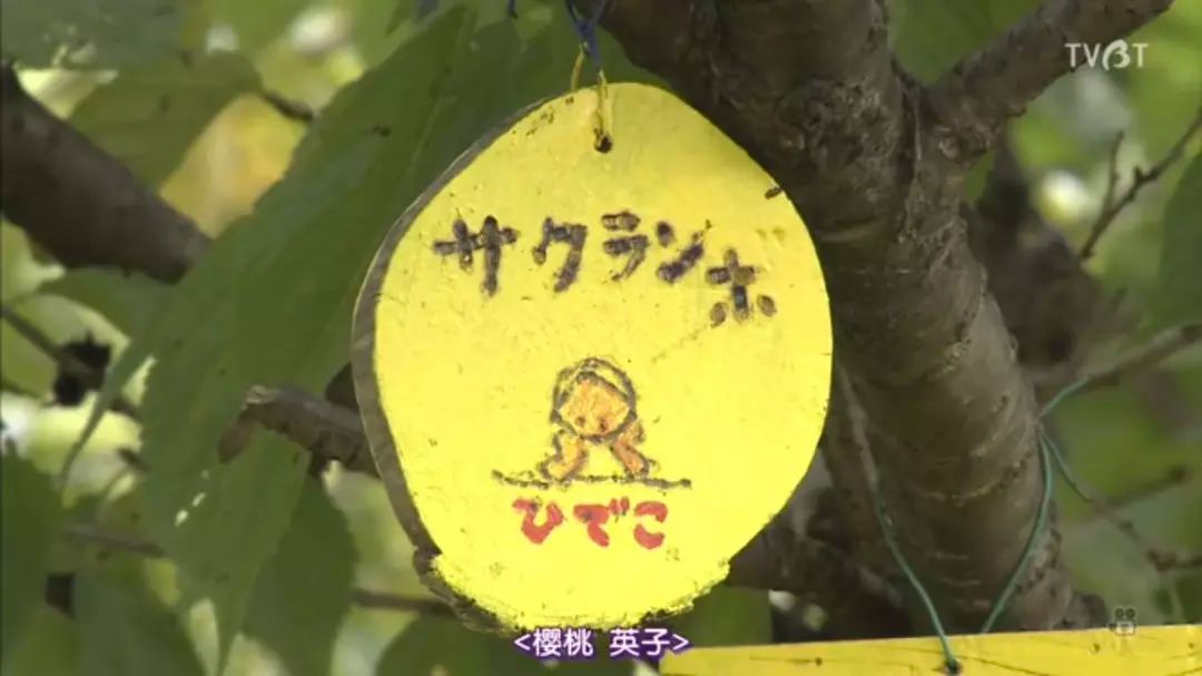 樱桃树上一个圆圆的小木牌,涂成黄色,上面写着樱桃,下面画着他最爱的英子奶奶。