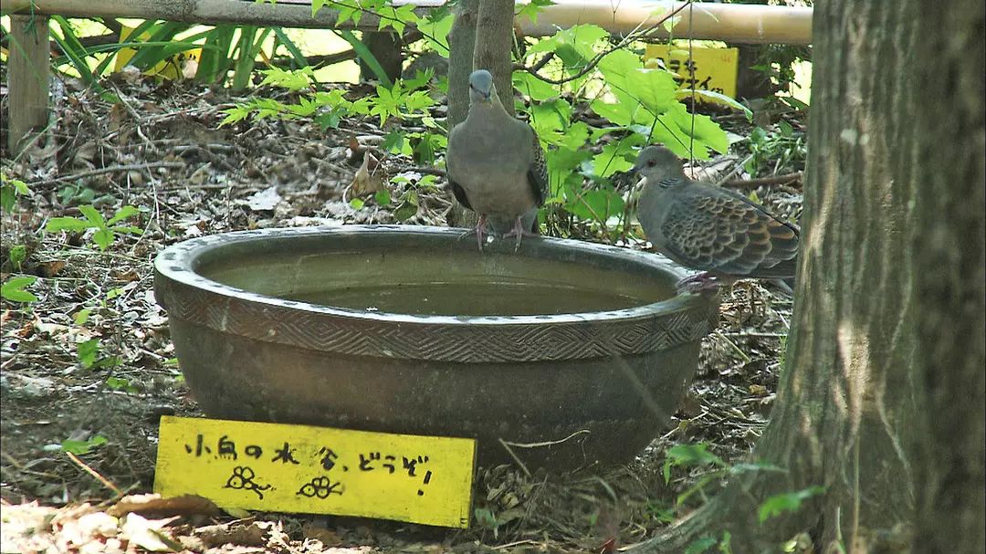 修一爷爷为他们准备了一口圆圆的水盆,供它们喝水、梳洗羽毛。