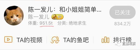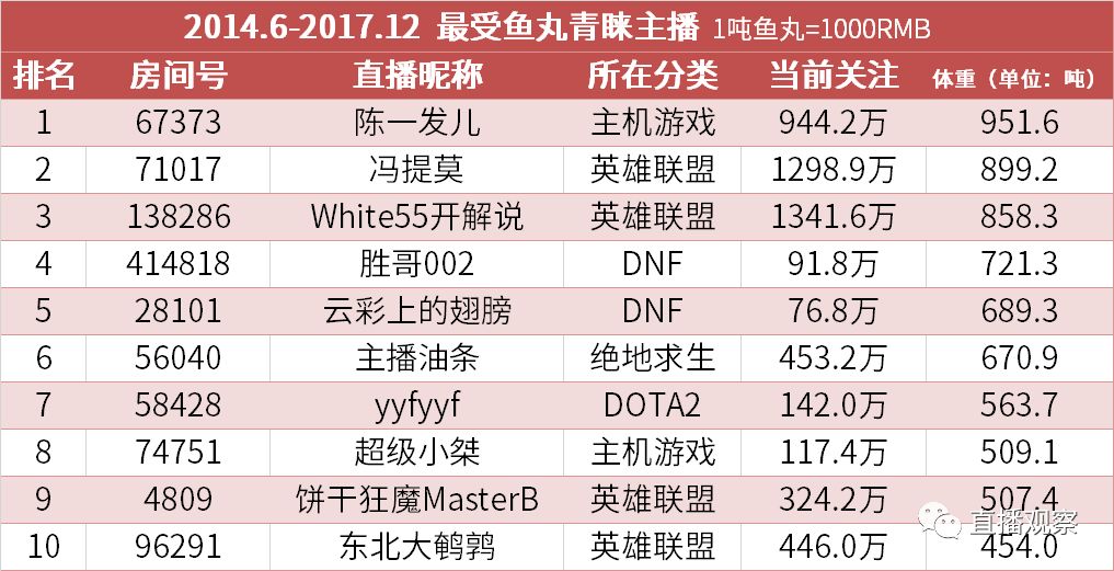 如图,收到鱼丸最多的主播分别是陈一发、冯提莫和五五开。发姐毕竟是发姐,全台最爱的主播;冯提莫如果在17年没有因为续约合同问题停播一个月,按照17年冯提莫的鱼丸增长速度,提莫的体重有可能破1000吨(价值100万人民币),五五开虽然停播,但曾经的“平台一哥”并非浪得虚名,拥有最高的关注,体重也排名第三。