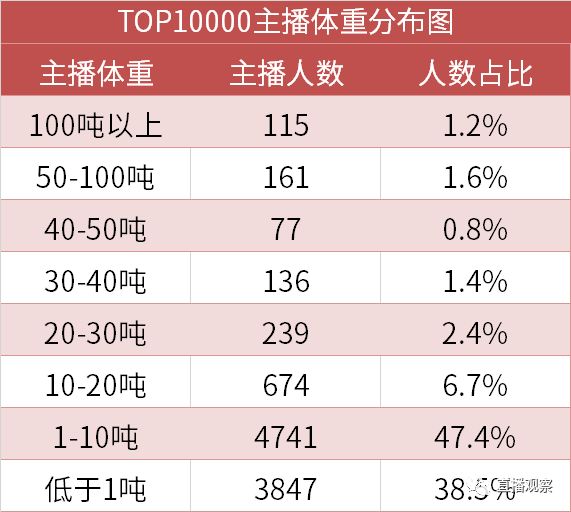 如上图,在体重前10000主播里,体重过100吨的仅有115人,85.9%的主播体重不过10吨,鱼丸财富还是掌握在少数人手里。
