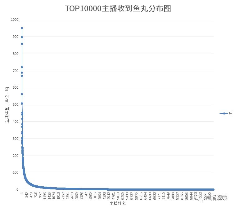 主播体重呈现出“L型分布”的特点,头部1%的主播占了31%的鱼丸重量,大量的鱼丸还是集中在头部主播身上。第一名发姐拥有951吨-价值95万人民币的鱼丸,第10000名主播“MMMMMecon”(绝地求生主播)拥有0.1吨鱼丸-价值人民币100元,主播与主播之间的鱼丸收入可见差距之大。