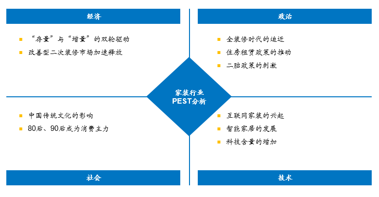 在这里,睿信致成采用了PEST分析的视角。PEST分析是咨询行业经常用到的宏观环境分析工具,不同行业和企业根据自身特点和经营需要的不同,在具体的分析内容上可能会有差异,但一般都会考虑到政治(Political)、经济(Economic)、社会(Social)和技术(Technological)这四大类影响企业的主要外部环境因素。对于家装行业的发展现状和未来前景,笔者也将着重从这几个方面进行论述。