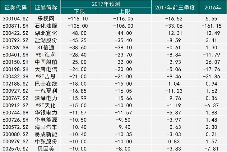 獐子岛(002069.SZ)的扇贝又“跑了”,该公司发出业绩下修公告,预测净利润金额由最高盈利1.1亿元调整至最大亏损7.2亿元;巴士在线(002188.SZ)子公司董事长失联了,该公司只得计提商誉减值,预测净利润金额一夜间从最高盈利2.1亿元跌落至最大亏损18亿元;ST保千里(600074.SH)也“任性”了,原实际控制人侵占公司利益事件影响不减,该公司无法确定亏损金额;贾跃亭至今未归,留下了深陷泥淖的乐视网(300104.SZ)又发出去年净利润亏逾百亿的公告;国际油价回升了,但油服龙头企业石化油服依然无可奈何,抛出了预亏106亿元的重磅炸弹······