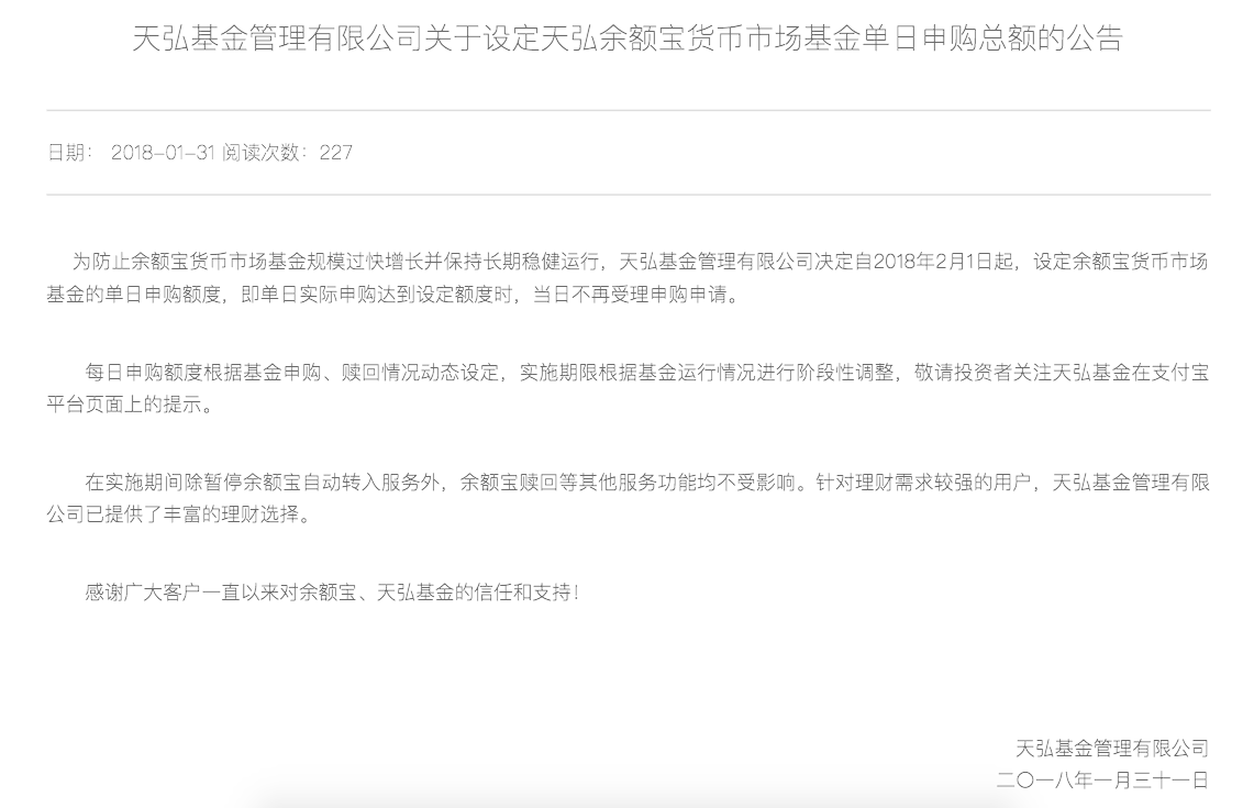1月31日,天弘基金发布公告称,自2月1日起,将设置余额宝每日申购总量,即单日实际申购达到设定额度时,当日不再受理申购申请。每日申购额度根据基金申购、赎回情况动态设定,实施期限根据基金运行情况进行阶段性调整。