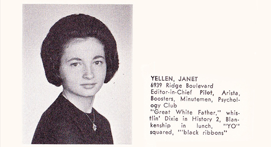 她还是校报《The Pilot》的主编。每年该报编辑都会去采访代表班级发表毕业演讲的人。那年耶伦既是编辑,又是演讲者,所以她就自己采访了自己。她在采访中谈到了对于旅行的热爱、收藏的石头,以及念大学的计划。
