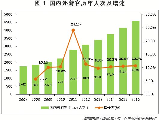 据国家统计局数据显示,国内外游客历年人次增速和国内旅游总花费增速基本呈现出相同趋势,自2012年后分别维持在10%、15%附近(参见图1、图2),这表明当前中国旅游行业正处于“成长—成熟期”阶段,红海市场即将形成,行业内竞争加剧。