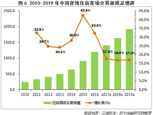 此外,前文提到民宿需要争抢现有市场份额来谋发展,那么,酒店将是其必须正视的一座“大山”。而据艾瑞咨询数据显示,中国在线酒店交易规模的增速受旅游业行情的影响,自2015年起下滑,但是其增速未来几年仍将大致维持在17%左右的高位(参见图6),总体来看,酒店的经营表现也算得上亮眼。所以,作为将要向酒店争夺市场份额的潜在进入者,民宿的胜算又有几分呢?