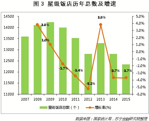 随着红海市场的形成与竞争加剧,行业的新进入者会减少,原先行业内的企业也会陆续退出,这一点,从星级饭店的历年增速或许可见一斑。自2010年开始,星级饭店的总数整体上呈现下降趋势(参见图3)。