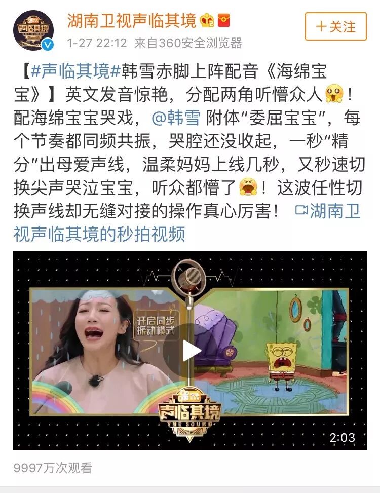1月27日,湖南卫视配音综艺《声临其境》播出第四期,这期节目请来了四位女明星作为配音老师:徐帆、马思纯、贾静雯、韩雪,从国内一线女演员到金马影后,卡司阵容亮眼——但没想到当晚表现最出彩的是韩雪,一段全英文海绵宝宝的配音惊艳四座。