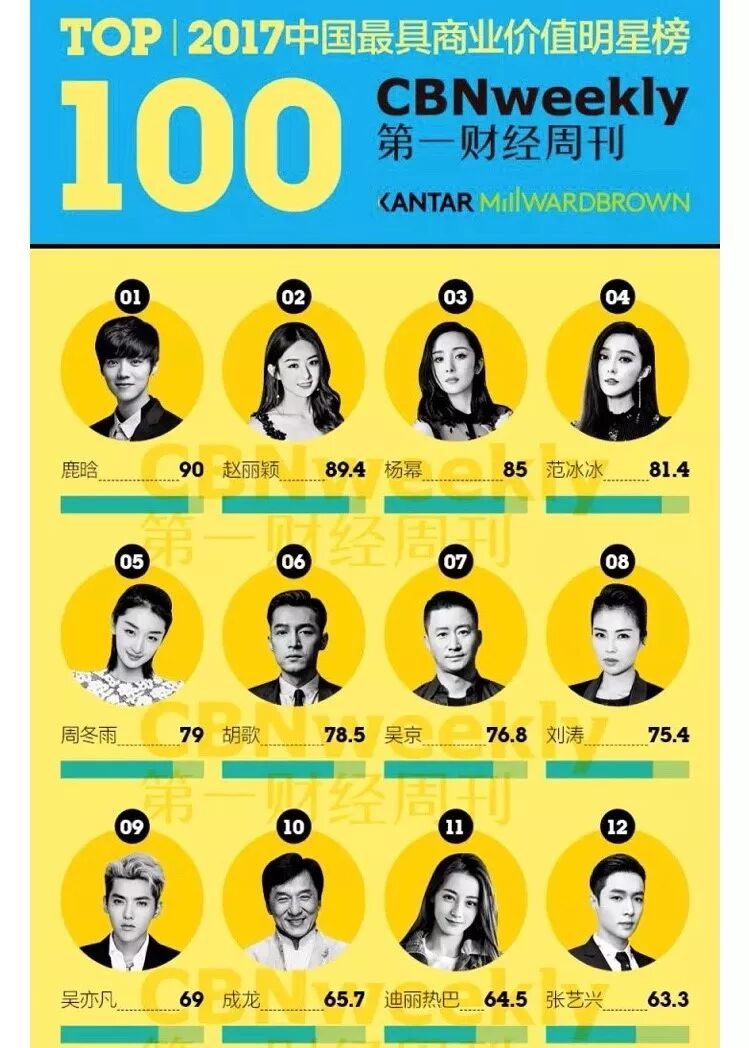 2017年底《第一财经周刊》根据大数据统计出了一份2017年最具商业价值明星榜,榜单前十名除了成龙大哥几乎一水儿的流量明星,其中吴京因为56亿的《战狼2》位居第七,前三名是鹿晗、赵丽颖、杨幂。《第一财经周刊》将榜单的关键词定位“流量”是正确的。