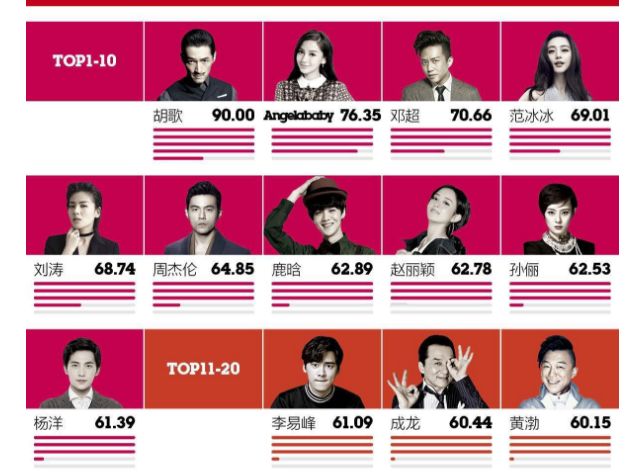 而2016年胡歌取代李易峰登顶第一名,李易峰则掉出榜单前十名,杨颖依旧是2016年最具价值的女明星,而赵丽颖作为新生代小花挤进前十。到了2017年榜单上的前十名几乎换新,杨颖不再前十之列,周冬雨则首次登陆前十。