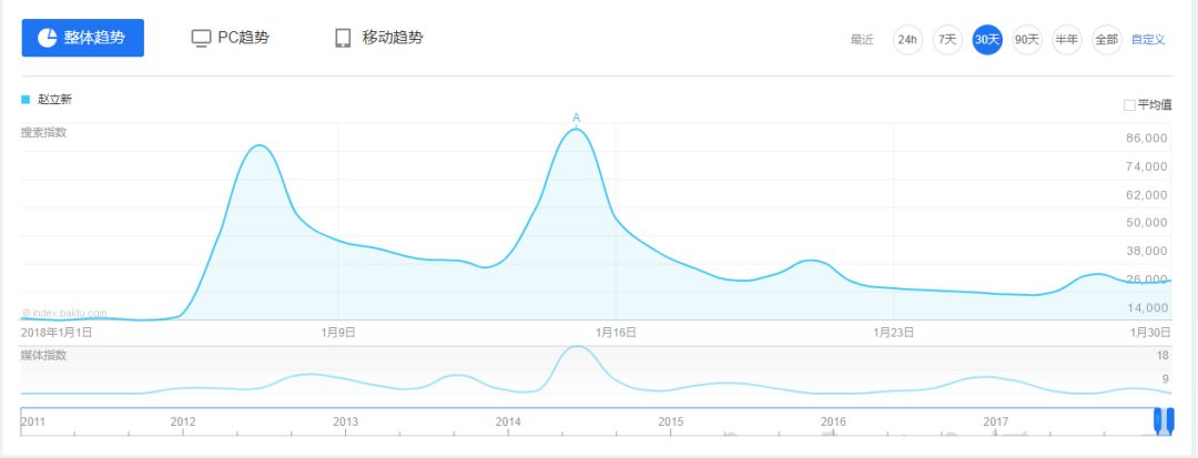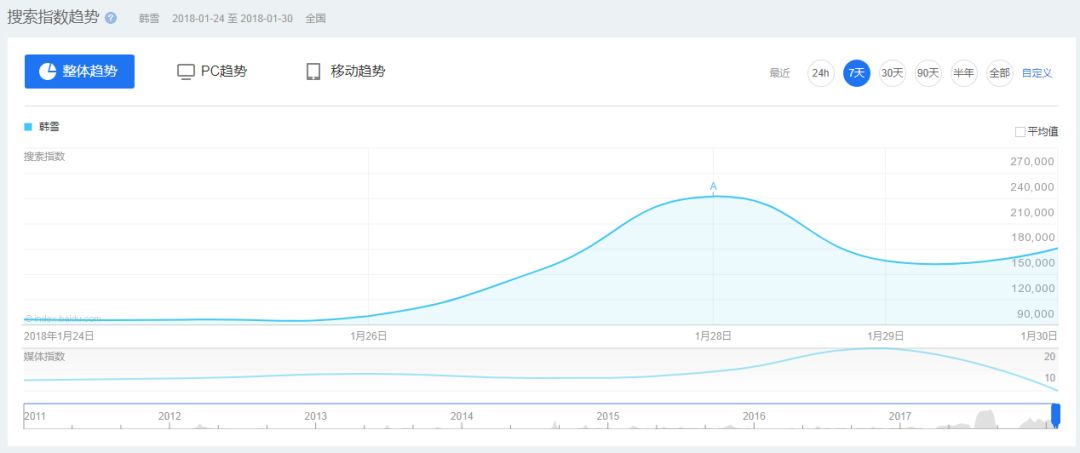 而韩雪在节目中动情的哭戏、旗袍扮相甚至采访时戴眼镜的装扮都在微博上引起的广泛的讨论,各路KOL、微博大V转发内容,隔天(1月28日),韩雪的百度搜索指数达到21万,是韩雪从2017至今指数最高的波峰。