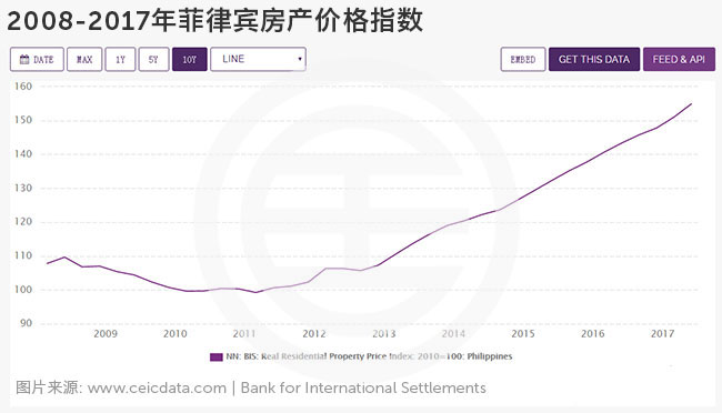 2012年起,随着菲律宾经济持续好转,其房价也随着进入稳定、快速的上涨态势。尽管如此,相对于香港、新加坡等亚洲发达地区,菲律宾房价还处于较低水平,有着很大的成长空间。