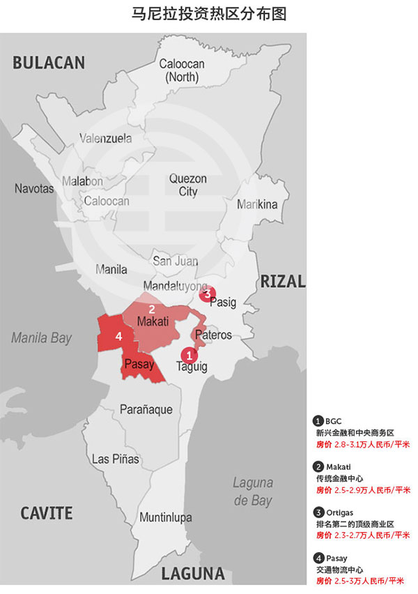 当前,中国买家多集中在菲律宾首都-马尼拉都会区,而在占地面积超600平方公里、人口超过1000万的马尼拉都会区中,最受中国买家喜爱的投资区域也多集中在老牌金融中心马卡蒂中央商务区 (Makati CBD)、马尼拉大都会区的浦东新区博尼法西奥环球城(BGC)、新兴金融区欧提加斯中心 (Origas Center)、交通物流中心帕塞市 (Pasay)等区域。
