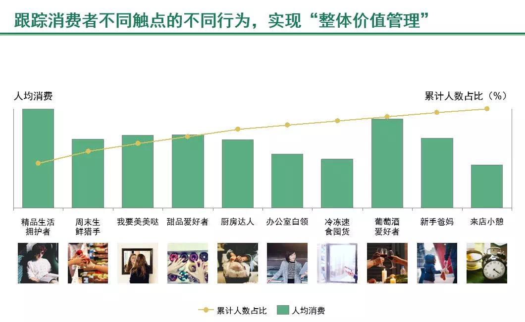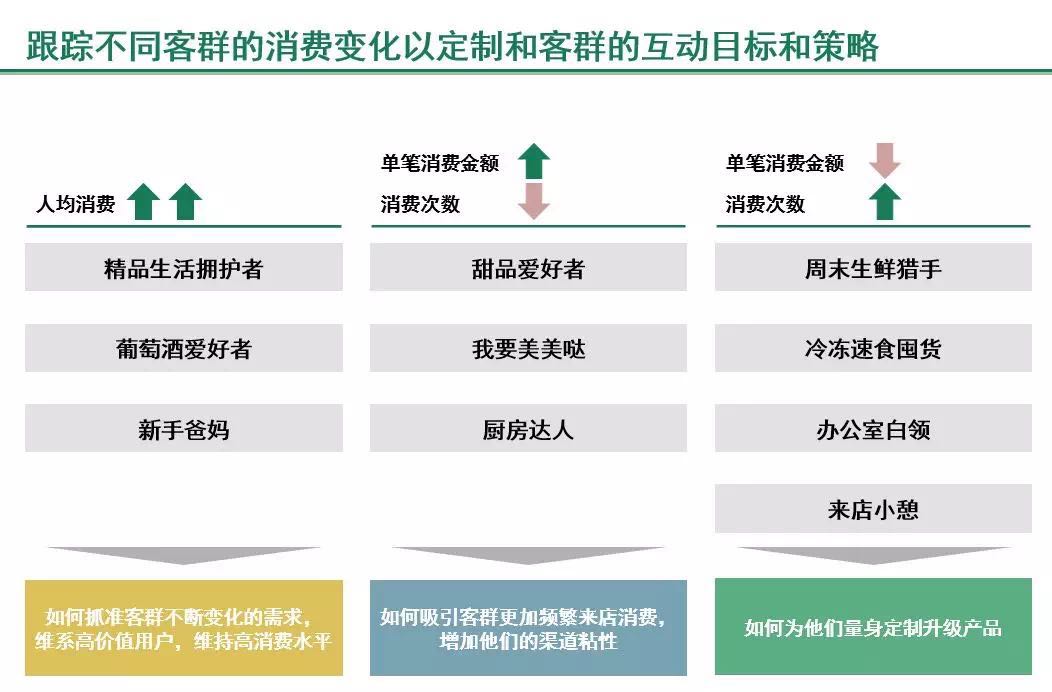 我们叫他们:精品生活拥护者、周末生鲜猎手、“我要美美哒”、甜品爱好者、厨房达人、办公室白领、冷冻速食囤货、葡萄酒爱好者、新手爸妈、来店小憩者。我们跟踪了不同客群在不同触点数据的变化,密切观察他们的人数和所占比例、人均消费、购买产品、单笔消费金额、消费次数、增长趋势、价格敏感度等指标,基于这些数据判断并管理细分客群的“整体价值”, 确定与客群的互动目标,制定精准营销方式,寻找交叉销售机会。