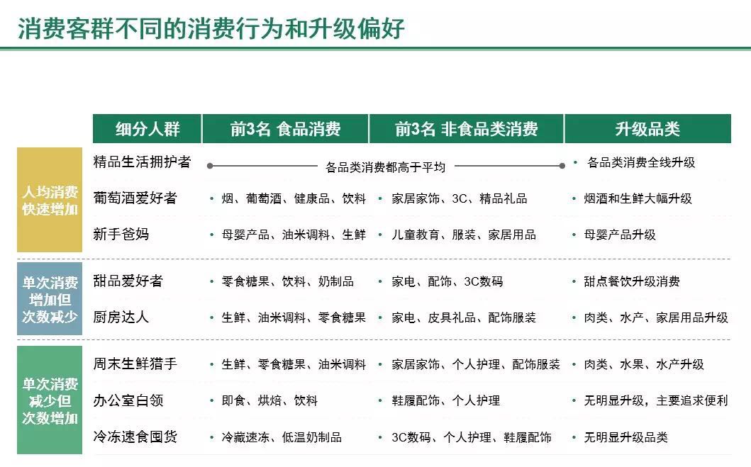 我们再来看一下消费潜力尚可开发,属于第二价值梯队的甜品爱好者数据。这类客群的主要消费升级品类是零食饮料,同时他们在小家电、配饰皮具、3C数码和零售餐饮上也都呈现出一定的消费升级趋势。其他家庭食品用品(人均消费均为100元左右)采购则在大众超市完成。