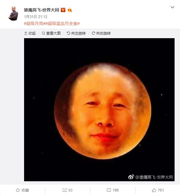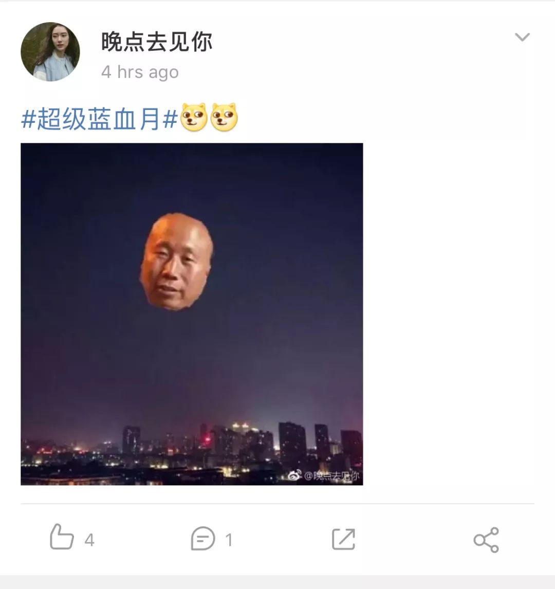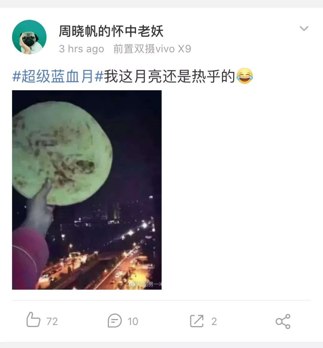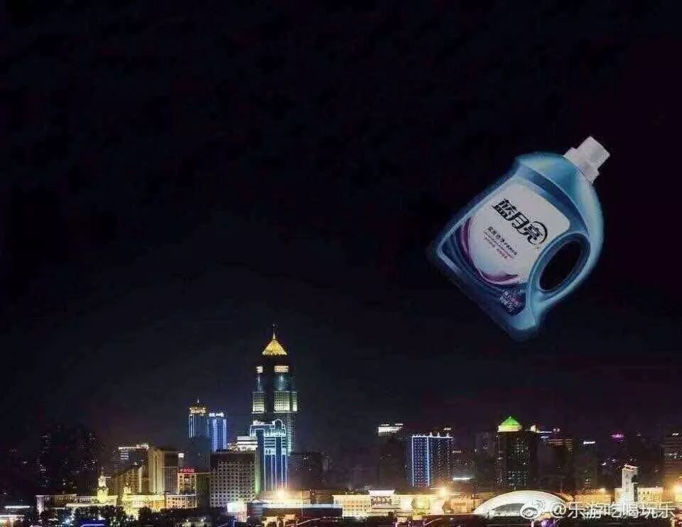再次深深钦佩拍到蓝血月的各位朋友圈摄影大师一秒钟。而拍不到蓝血月的网友们也脑洞大开,有P“蓝月亮”的: