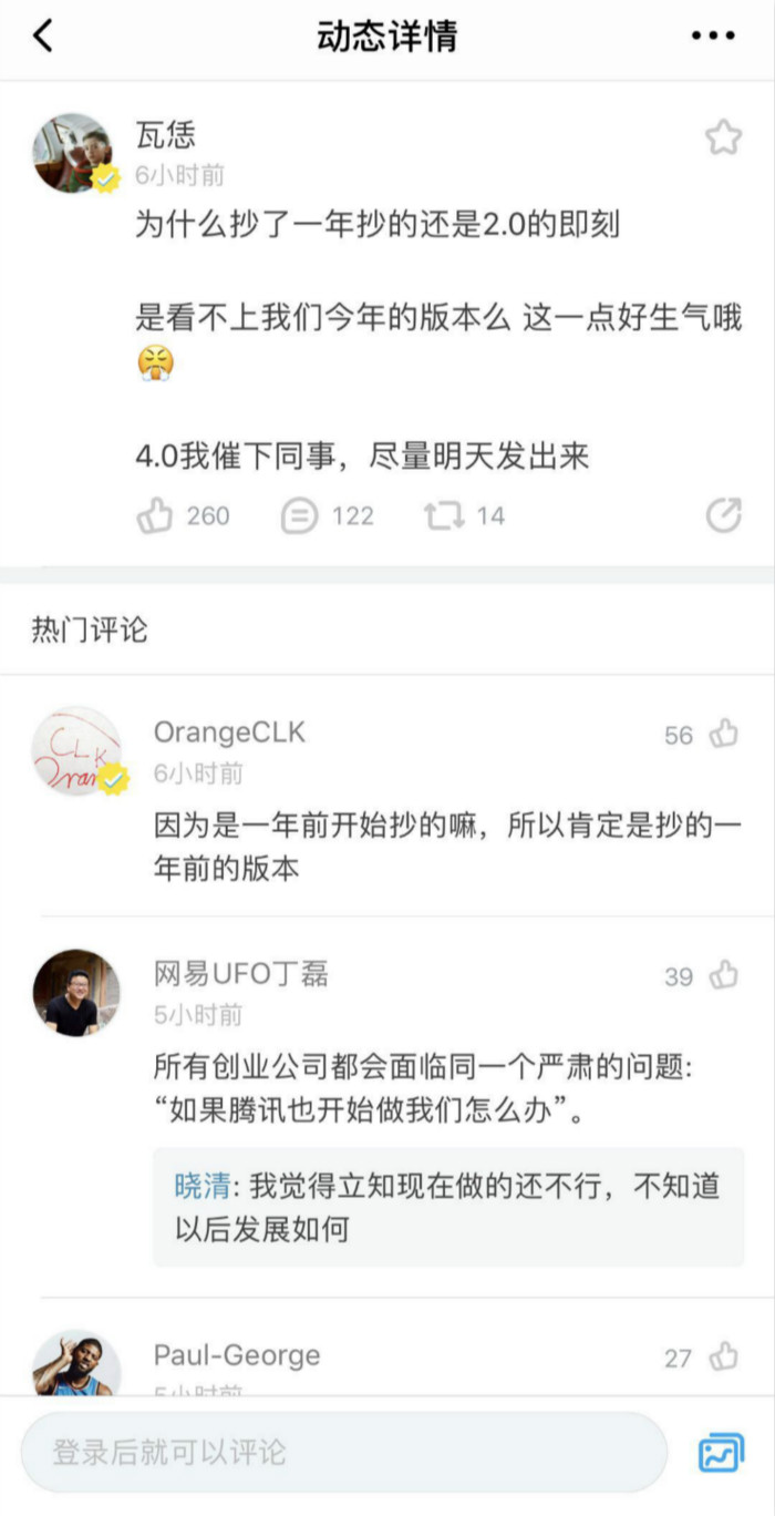 在放出内测后不久,不少用户开始反映,立知的内部布局和另一款内容资讯App“即刻”多有雷同之处。而即刻CEO叶锡东也在自己的即刻账户上不点名地吐槽了这个情况。