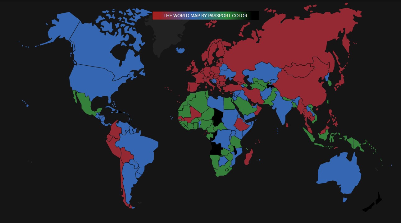 根据护照信息统计网站passportindex统计,目前全球签发护照的国家和地区共有199个,这也就是说护照的模样有199种。然而虽然这些护照的颜色都存在诸如草绿色、海蓝色、勃艮第红等细微差别,可看起来五颜六色的这199种护照其实主色只有红绿蓝黑四种,而且每种颜色背后都有相应的地理、政治甚至宗教原因。