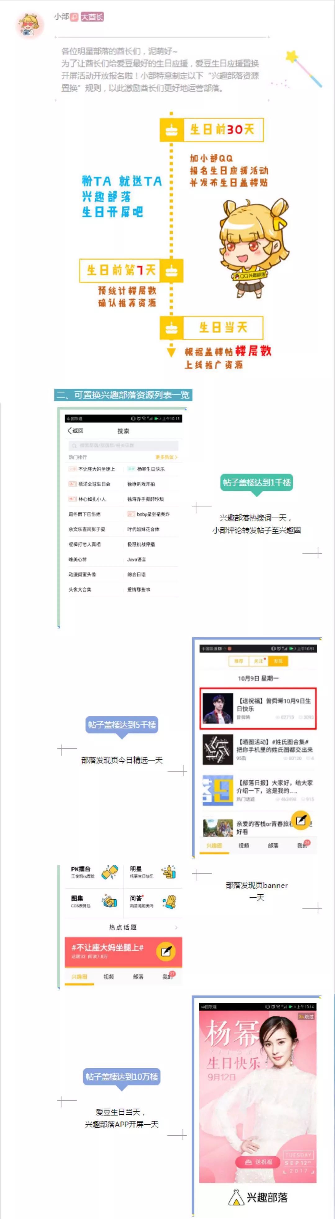 除此之外,Angelababy的兴趣部落大酋长Amuro告诉壹娱观察,在临近偶像生日的时候,他们还要去完成一件“重要任务”——争取兴趣部落APP开屏的广告位。去年10月,兴趣部落推出"爱豆生日应援置换开屏活动",只接受各大明星部落的首席/大酋长报名,活动轴时长为明星生日前一个月,通过发帖盖楼,兴趣部落会相应给到热搜词、今日精选、发现页Banner和APP开屏一天的资源置换。而在去年Angelababy的生日,他们则是通过公益募捐,最后把募捐证书送给了她当生日礼物。