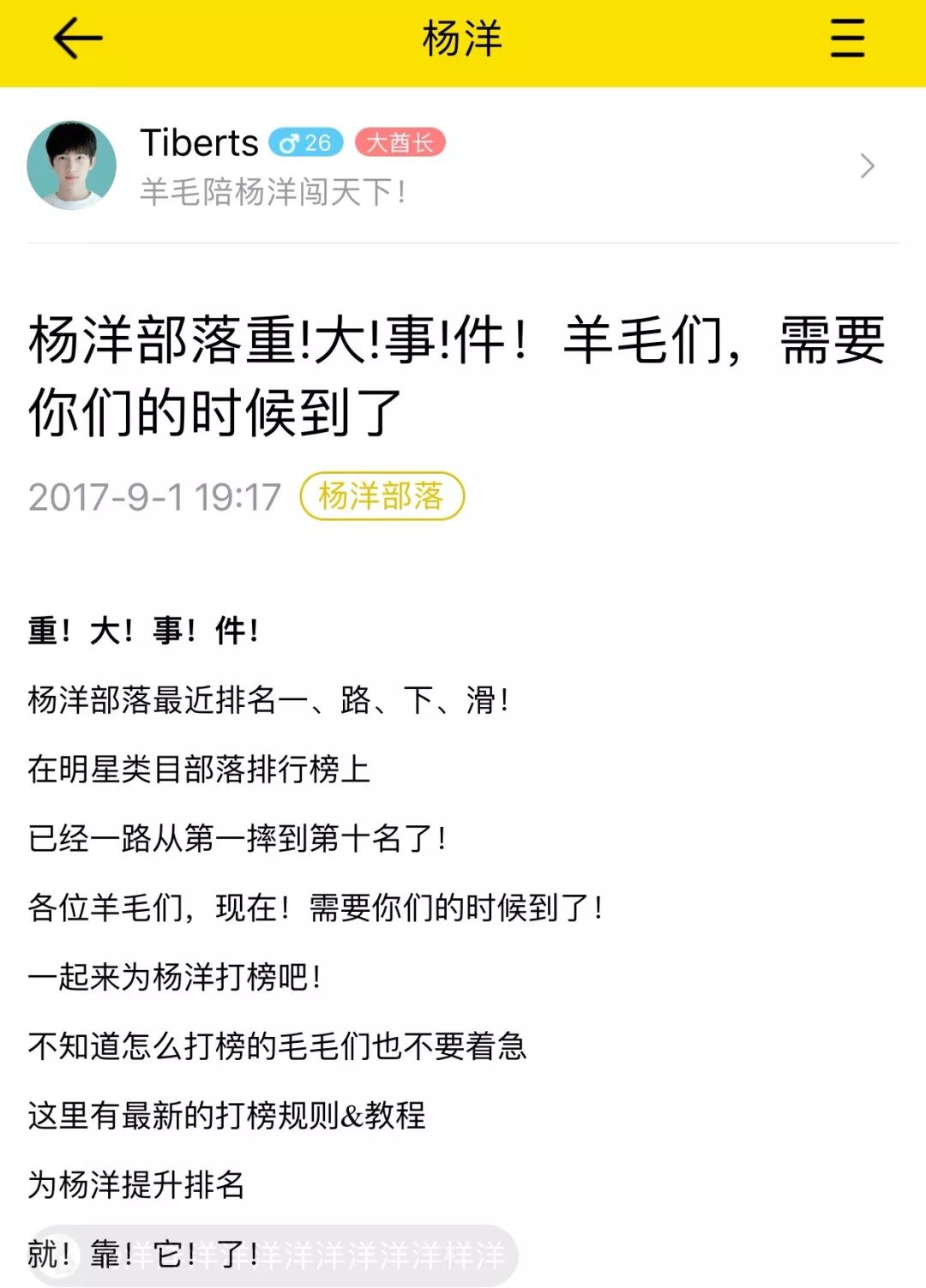 与杨洋部落相似,李易峰部落的分工同样很清晰。98年出生的颜鸿是李易峰部落的大酋长,她告诉壹娱观察记者,目前,李易峰部落的酋长有8个,负责统筹管理;小编20多个,负责发帖;暖贴10多个,负责给帖子点赞评论;美图10多个,负责作图;巡查20多个,负责发现好贴或者不好的帖子。这些粉丝各司其职,会把部落签到、打榜当做日常必做的工作之一。