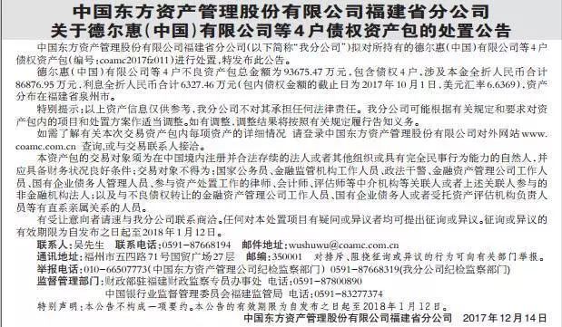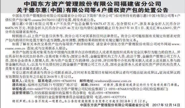 近期,中国东方资产管理福建省分公司在《福建日报》发布了一则债权资产包的处置公告,德尔惠欠债共计6.36亿元,包括厂房、土地和仓库在内的多处资产被挂牌抵押拍卖,公司也已停业。