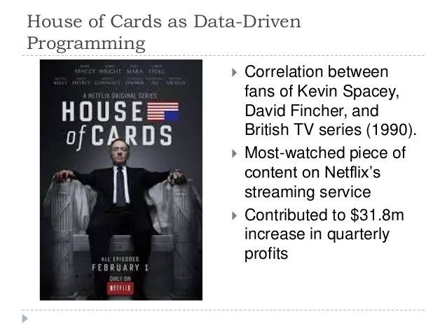 Netflix数据库里多年来储存着的上亿条用户观影数据,在此刻迸发光芒!大数据法宝分析出,Netflix的很多用户观看过1990年版本的《纸牌屋》,而这部分用户还经常观看导演David Fincher的作品,还有他们还喜欢KevinSpacey这位奥斯卡影帝的表演。