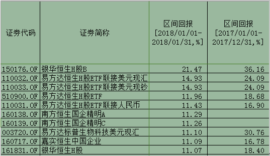 2018年开年以来,全球股指上涨行情不改,一月恒生指数继续飚涨9.92%,纳斯达克上涨7.36%。就一月份表现而言,银华、易方达、南方基金几乎包揽了QDII基金月度收益榜前十,其中银华恒生H股B表现最好,观察其四季报披露的持仓,前十大重仓股中有7只为大盘银行保险股,还重仓了中石油(H)、中石化(H)。得益于一月份大盘银行股、保险股的暴涨,以及油价上行带动“两桶油”股价上涨,该基金一月区间回报达21.47%;此外,易方达旗下的5只QDII基金也在一月份取得了超过10%的收益,其中4只投向港股的产品中,四季度重仓股也基本都为“银行保险+两桶油”。