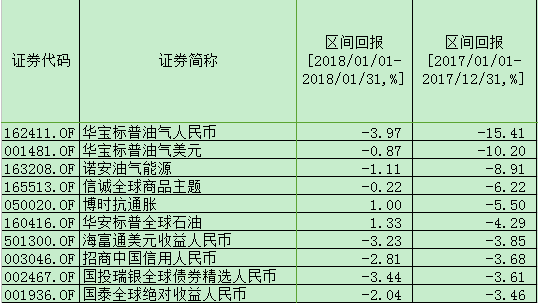 如果将观察周期延长,一月涨幅居前的QDII基金在2017年也都取得了不错的收益,但油气类基金却普遍收益不佳,如华宝油气基金净值2017年出现了暴跌,原因是该基金重仓的石油采掘板块并非是2017年美股风口;此外,2017年收益尚可的华夏大中华企业精选由于踩雷“神雾双雄”,一月份基金净值跌幅6%,未能延续上涨态势。