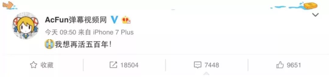 2018年2月2日上午9时50分,弹幕视频网站AcFun官微发布了一条信息:我想再活五百年。