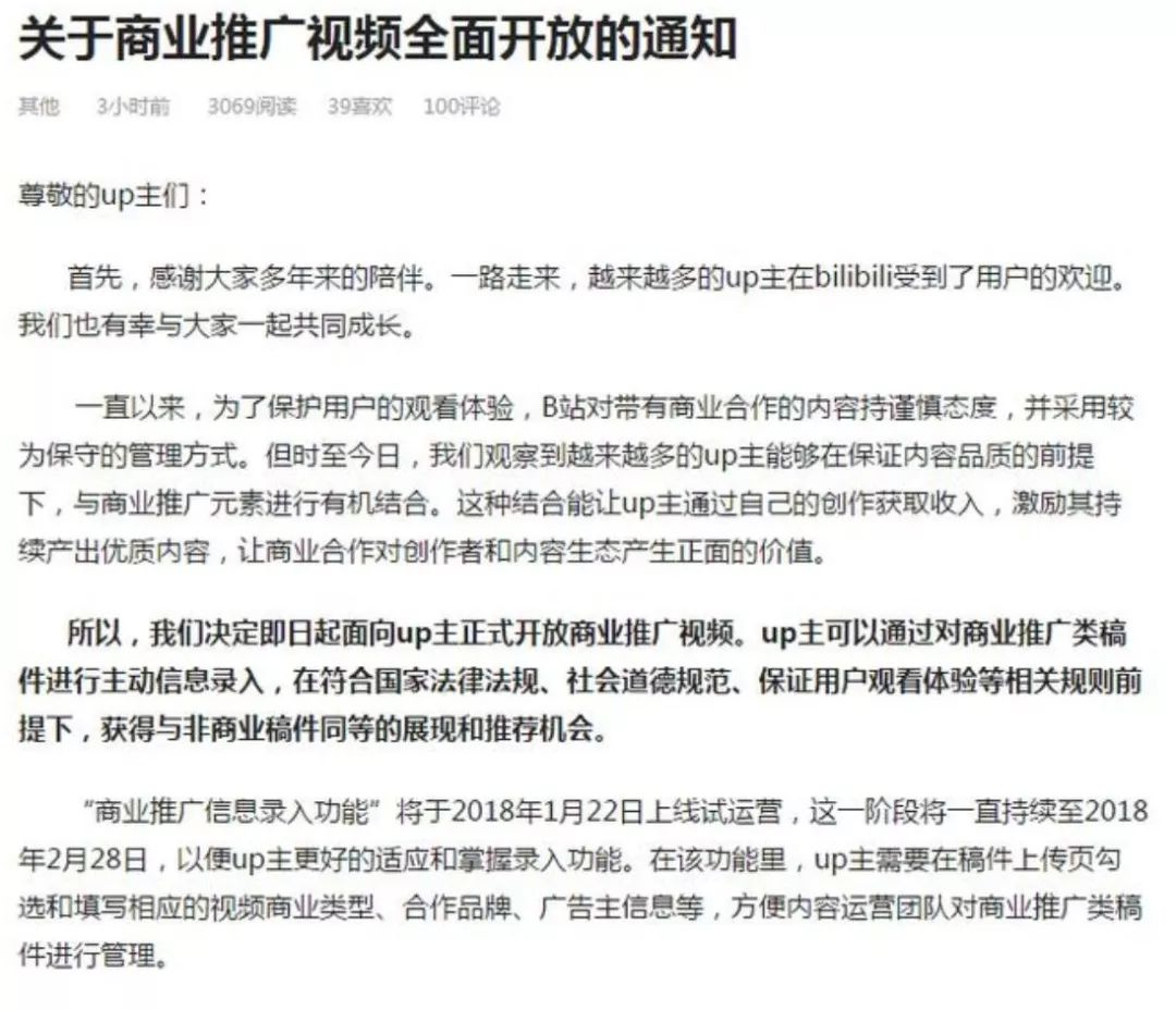2018年1月底,B站开始允许up主上传带有广告功能的视频,且该类视频能够获得不受限制的推荐位。粉丝有所反弹,但B站已不用为存亡发愁。