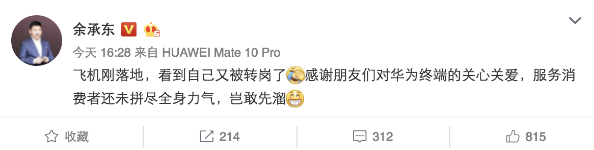 就在华为官方回应这一消息后不久,余承东在个人微博上提到:“飞机刚落地,看到自己又被转岗了感谢朋友们对华为终端的关心关爱,服务消费者还未拼尽全身力气,岂敢先溜”。