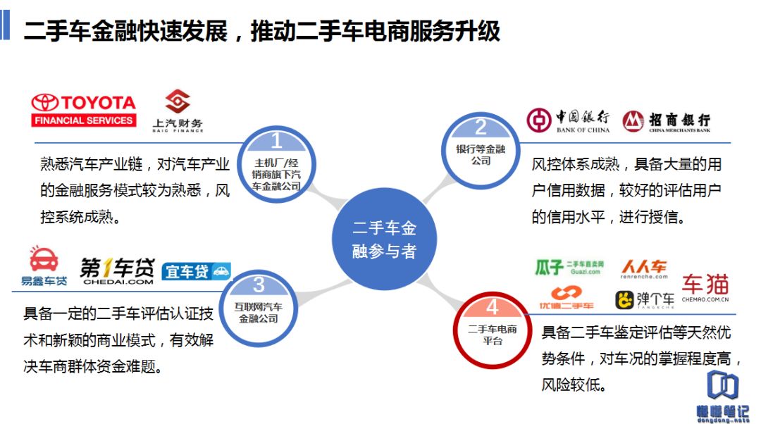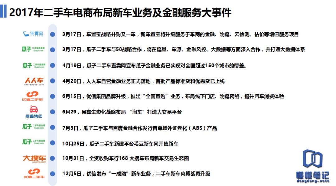 此外,懂懂笔记和企业头条共同回顾2017年行业进程时发现,多个二手车电商平台也布局了汽车金融,包括人人车、瓜子、优信、大搜车等,有的平台甚至还联合了上下游产业链、银行、互联网金融机构,比如中国银行、招商银行等等。