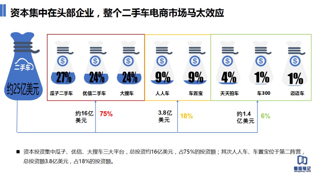懂懂笔记和企业头条根据有实锤的融资消息联合统计后看到,2017年二手车电商行业的总融资额超过25亿美元,其中75%的融资额集中在瓜子、优信和大搜车这几个平台,18%的融资额被人人车和车置宝拿走,其余平台拿到了融资总额的6%。