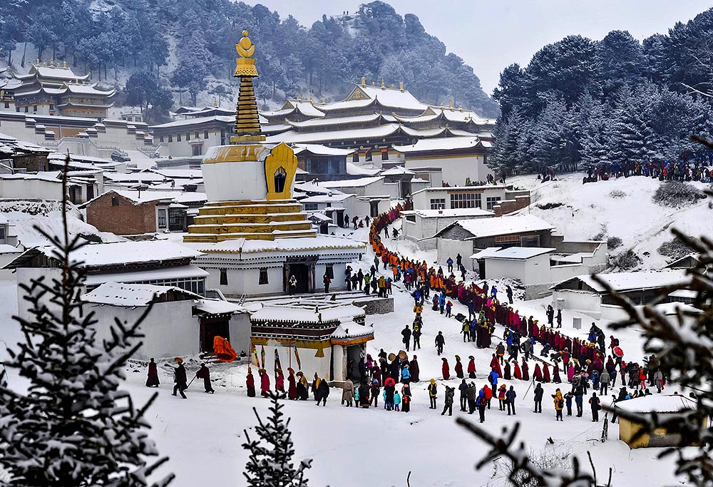 藏历新年会持续十五天。每年正月十三夏河拉卜楞寺都会举行甘南藏民最期盼的节日——晒佛节。这天藏民会穿着节日的盛装,一大早就来到当地的寺院准备晒佛。大喇嘛会率领僧众把寺院里珍藏的巨幅唐卡 ( 平时是卷起来收藏保护的 ) 抬出来展示于光天化日之下及广大信众面前,即使你没有虔诚的信仰,也必定会被那场面所震慑到!图片来源:视觉中国