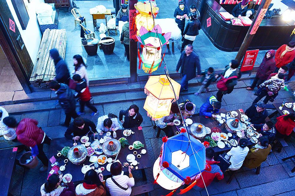 春节的乌镇仍保留着大摆长街宴的习俗,初一到初七,延绵数十里的西栅老街上,家家户户沿街支灶搭台,空中弥漫着羊肉的香味。这情景可真是再现了明代诗人赵桓所描述的“长街迢遥两三里,日日香尘街上起”的盛况。图片来源:视觉中国