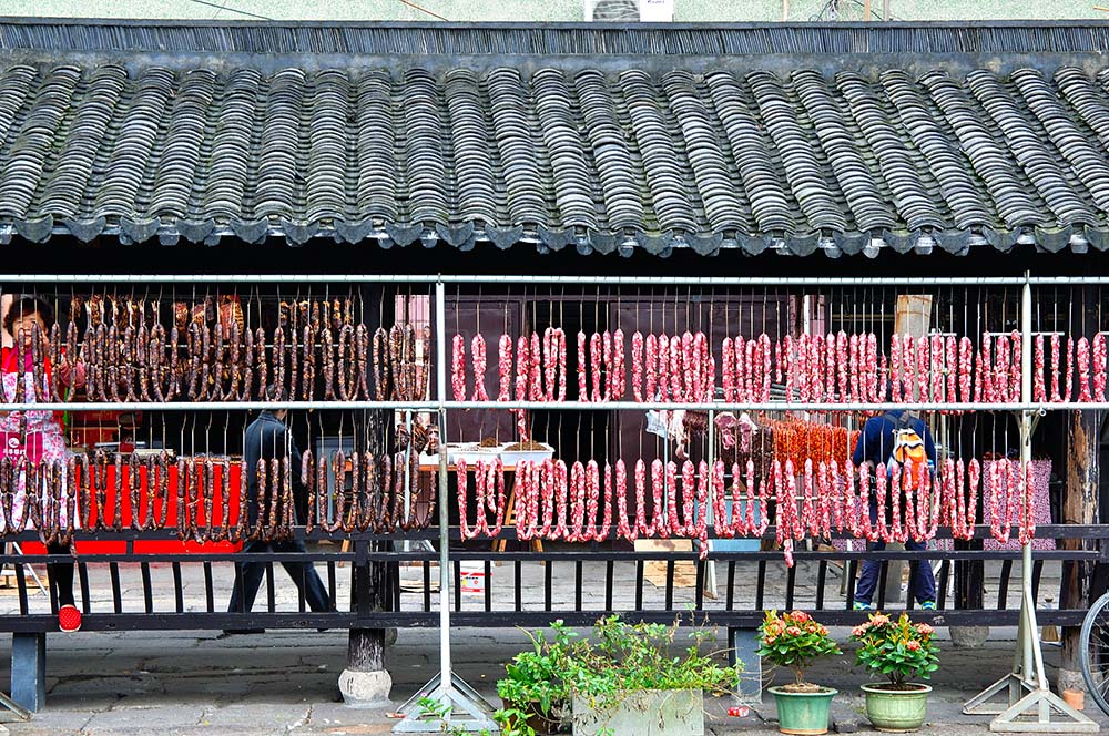 安昌古镇临水的老街挂满了腊味、酱货,空气里飘来浓浓的酱香味。在新年,暖一壶黄酒,切一碟腊肉,倚河而坐,岂不妙哉。图片来源:视觉中国