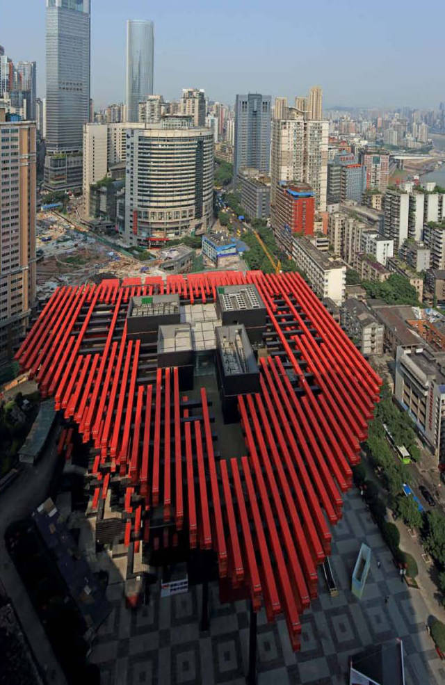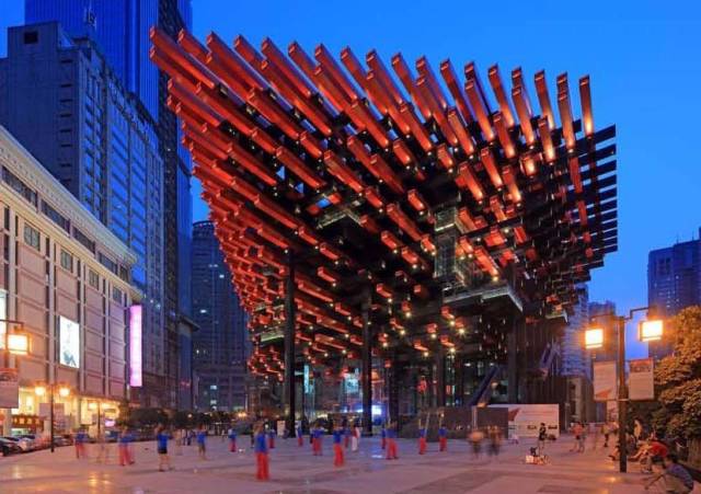 国泰艺术中心位于重庆市CBD核心区,整个建筑如同点燃的红色篝火,在欢乐地燃烧。
