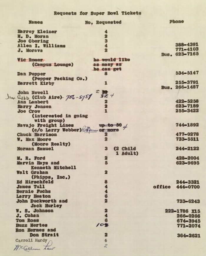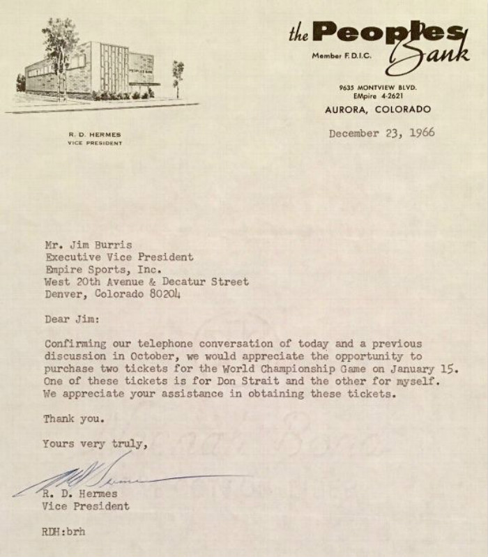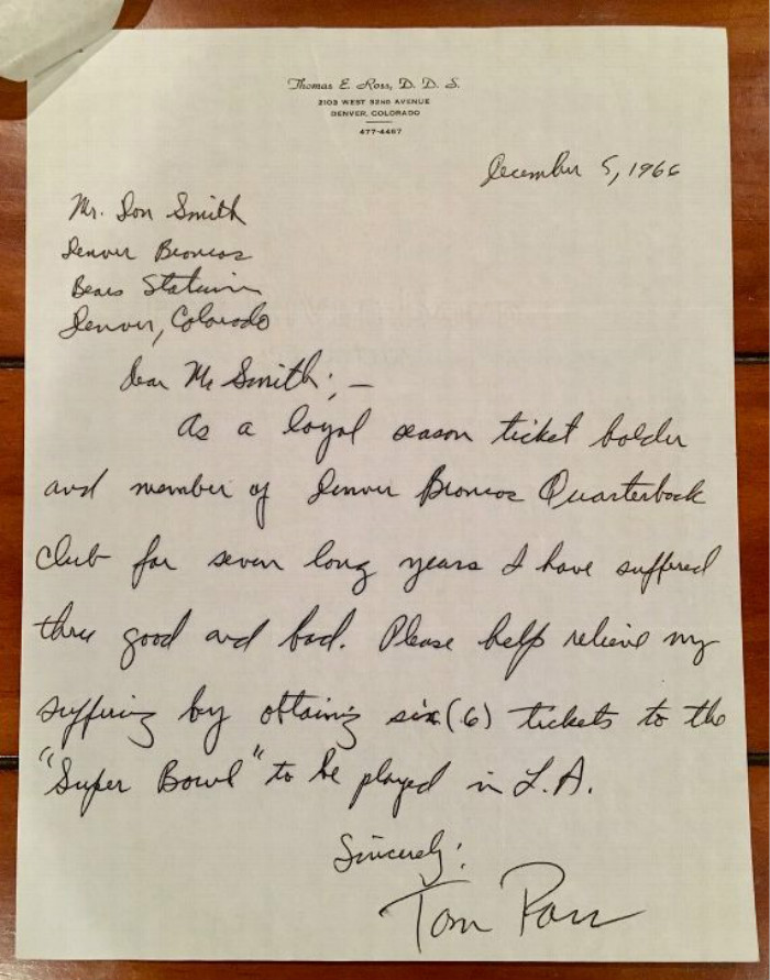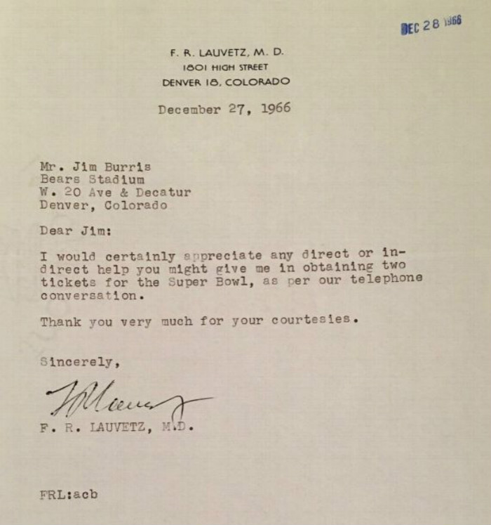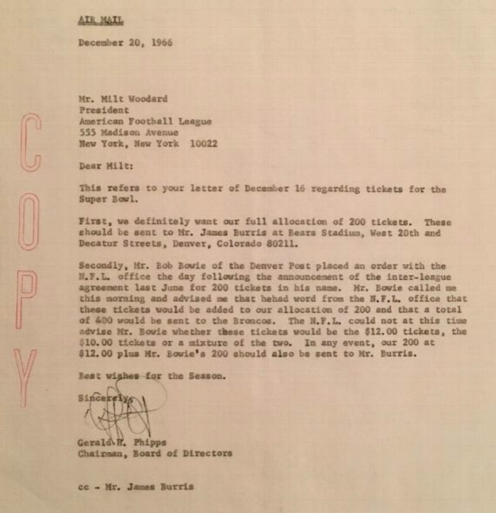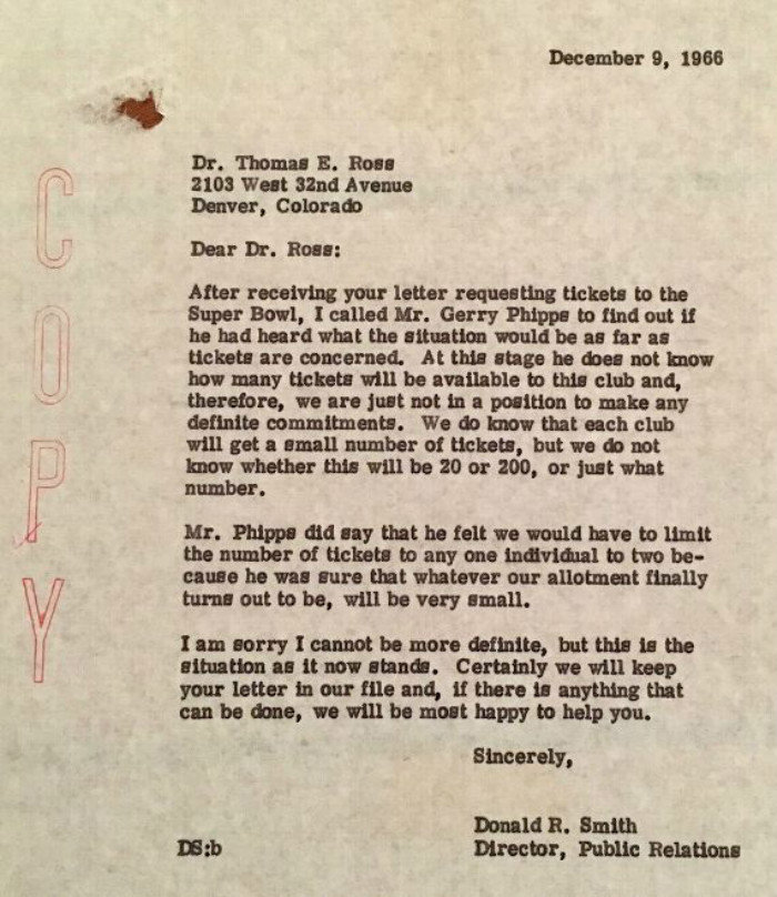 这些图片是丹佛野马队的一些季票持有者在1966年寄出的信。这些信件和其他的一些关于超级碗的文件都被前野马队的总经理吉姆·伯里斯保留了下来。伯里斯在2012年去世,而他所保留的这些文件则通过在线拍卖会的形式来到了一位专门研究野马队历史的收藏家汤姆·雅各布森的手中。就在最近,雅各布森发现了这些信件。