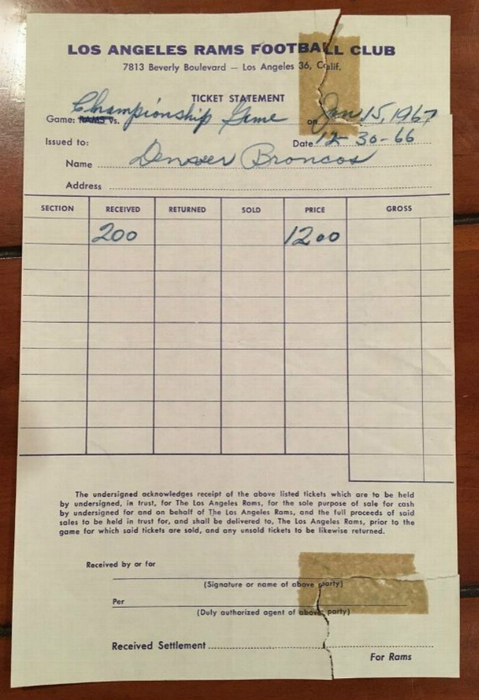 从洛杉矶公羊队的一份收据中我们可以得知(洛杉矶公羊队负责票务分配工作是因为这场比赛在洛杉矶举行,并且地点是在公羊队的主场洛杉矶体育场),野马队在10天之后的12月30日收到了200张门票的基本配额。