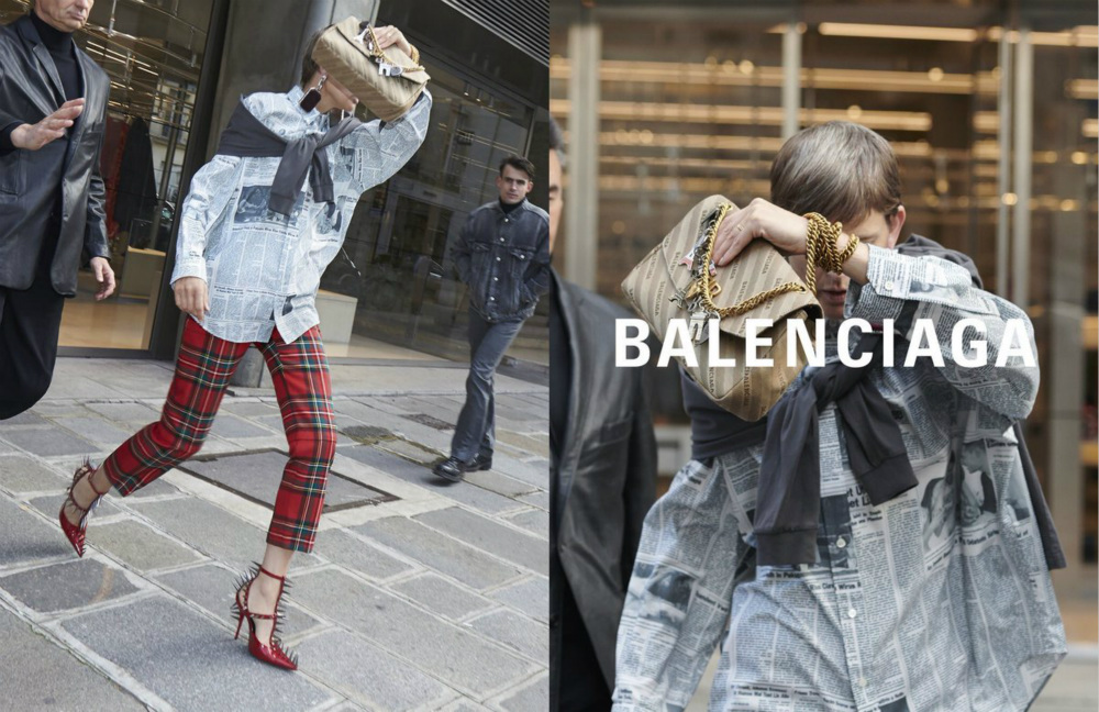Balenciaga刚刚发布的2018春夏系列广告大片就是利用了典型的狗仔队镜头拍摄方式。大片中模特的站位像是突然冒出来的,并且姿态像试图躲避镜头,这些照片唯一有别于真正狗仔照片的地方就是,模特都会用品牌标志性包袋和装饰性手链遮住脸,他们的头会倾斜到恰好的角度,以露出夸张的耳环。