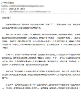 2月5日,盛大游戏官方发布公告称,经盛大游戏董事会研究决定:任命唐彦文先生为盛大游戏联席CEO,全面负责公司游戏业务,确保主营业务在盛大游戏新文化生态圈建设中的赋能作用。