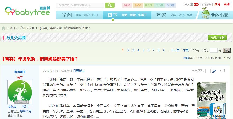 以宝宝树为代表的妈妈圈是很精准的细分市场,一条关于“【有奖】年货采购,精明妈妈都买了啥?”的互动活动在宝宝树论坛“育儿交流圈”推荐,吸引了7.9万次浏览,1600多回复,此类论坛“盖楼式”推广活动,伴随营销的预热期、促销期,对产品销售有直接的引导、促进作用。