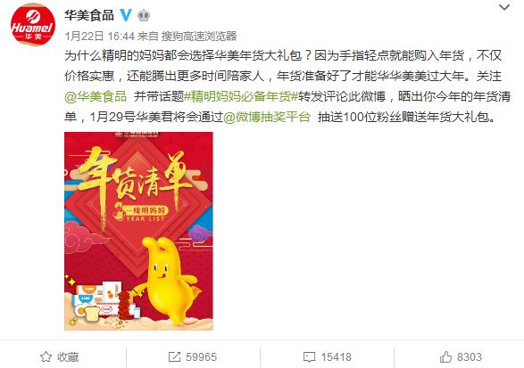 1、微博互动:在1月22日华美食品官微同样发起了#精明妈妈必备年货#的话题讨论,中国蓝TV、驴妈妈、南方黑芝麻糊、骆驼男装、搜狗、长虹等众多蓝V参与话题互动。