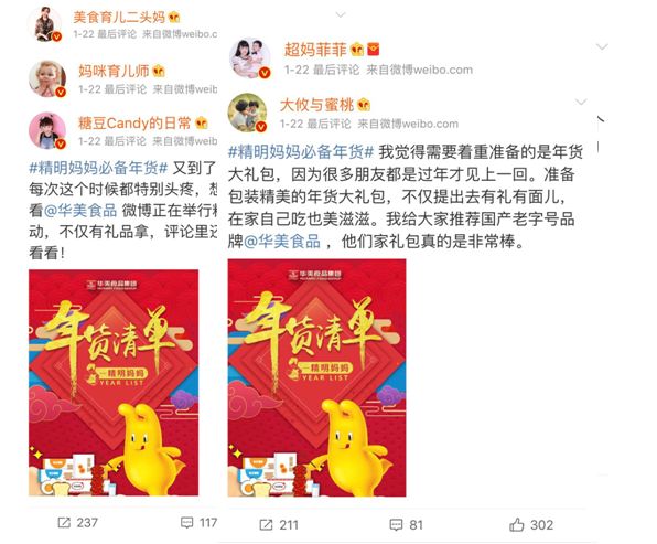微博母婴KOL@美食育儿二头妈、@妈咪育儿师、@糖豆Candy的日常、@超妈菲菲、@大攸与蜜桃等参与话题助推,#精明妈妈必备年货#话题6955万阅读。