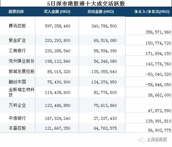 有四只个股同时登上沪市港股通和深市港股通的十大成交活跃股榜单,它们分别是腾讯控股、工商银行H股、紫金矿业H股和兖州煤业H股,上述个股在两个通道中的合计净买入额分别为9.4亿、6.9亿、3.78亿和3.8亿港元。