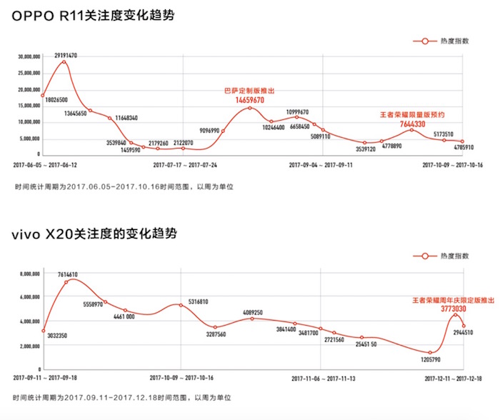 不过,从各家营销效果来看。可能是华为与保时捷,OPPO、vivo与王者荣耀的合作相对比较成功。而且,每次跨界营销推出时,手机的热度都会提升一个小台阶。